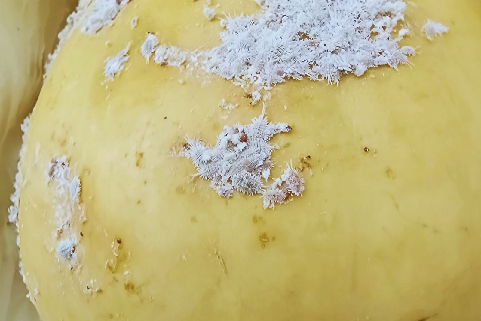 En la foto se observan las hembras ovíparas y los sacos ovígeros de Pseudococcus viburni correspondiente a la cría artificial.